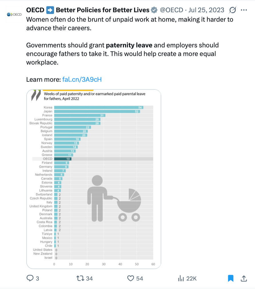 Similarly, on July 25, 2023, OECD published a tweet that said: “Women often do the brunt of unpaid work at home, making it harder to advance their careers. Governments should grant paternity leave and employers should encourage fathers to take it. This would help create a more equal workplace.”