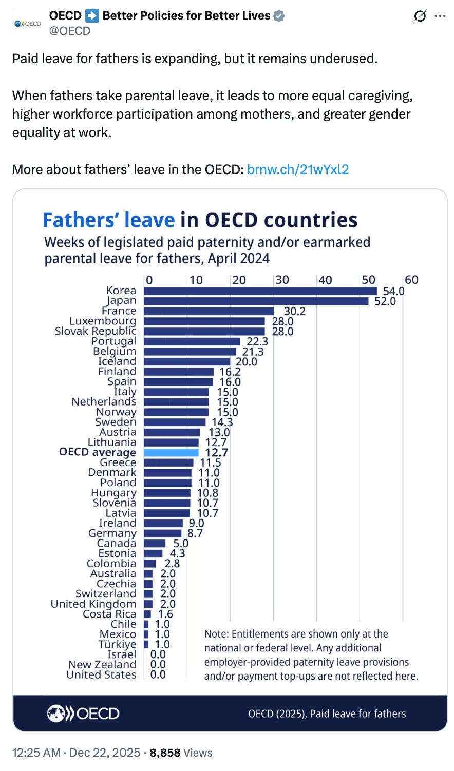 On December 22 of 2025, the Organisation for Economic Co-operation and Development (OECD) published a tweet about paternity leave and its purposes. In the tweet, the OECD said: “Paid leave for fathers is expanding, but it remains underused. When fathers take paternal leave, it leads to more equal caregiving, higher workforce participation among mothers, and greater gender equality at work.”