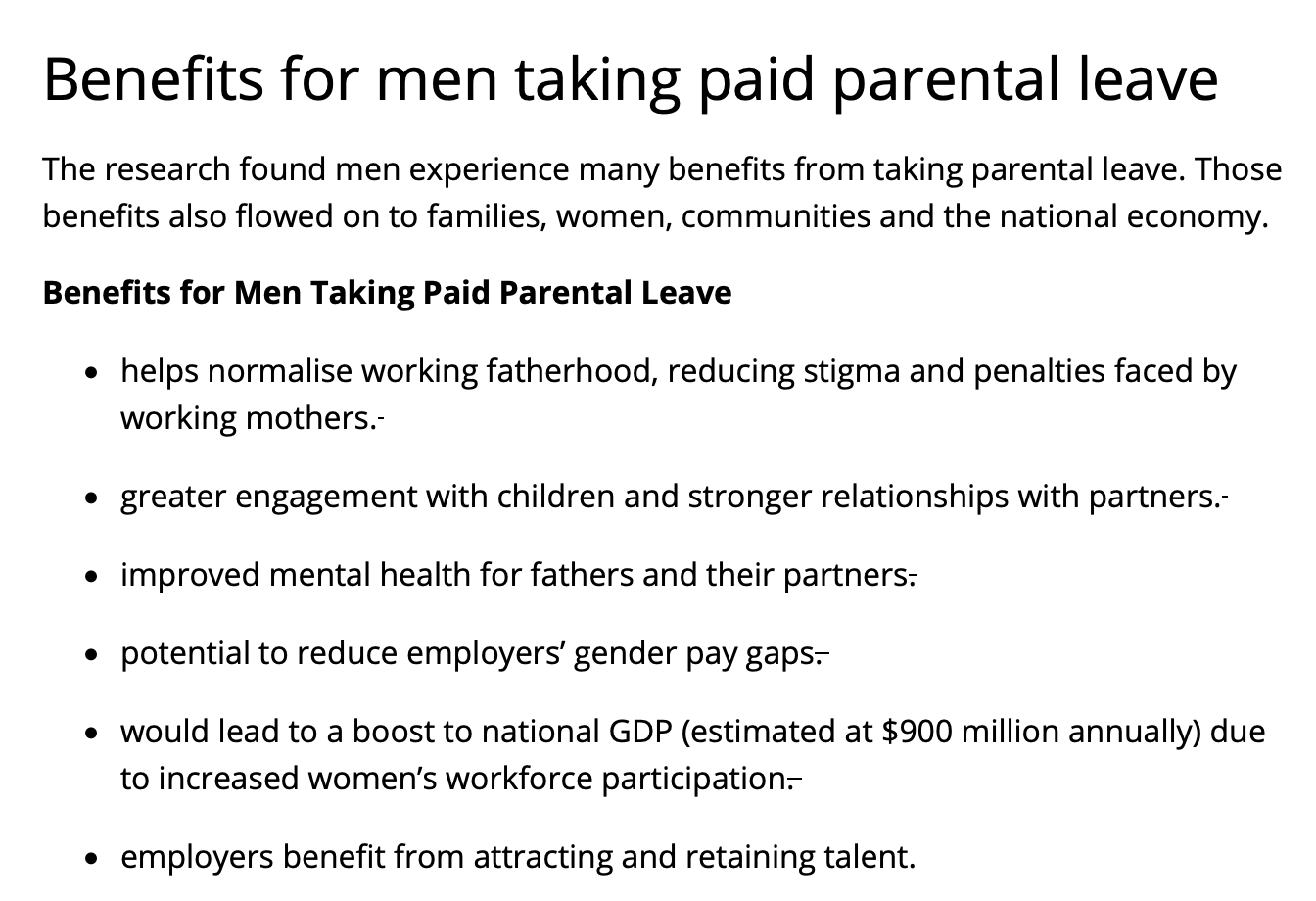 Remarkably, in the list of six items that were apparently intended to convince men about how paternity leave would benefit them, Australia’s Workplace Gender Equality Agency only listed three that are direct benefit to fathers. These included “greater engagement with children and stronger relationships with partners,” “improved mental health for fathers,” and “normalising working fatherhood.” However, even those items had caveats about how mothers would also be helped. Then, there were the three items on the “benefits for men” list that were clearly not benefits for men. They were benefits for women and employers.