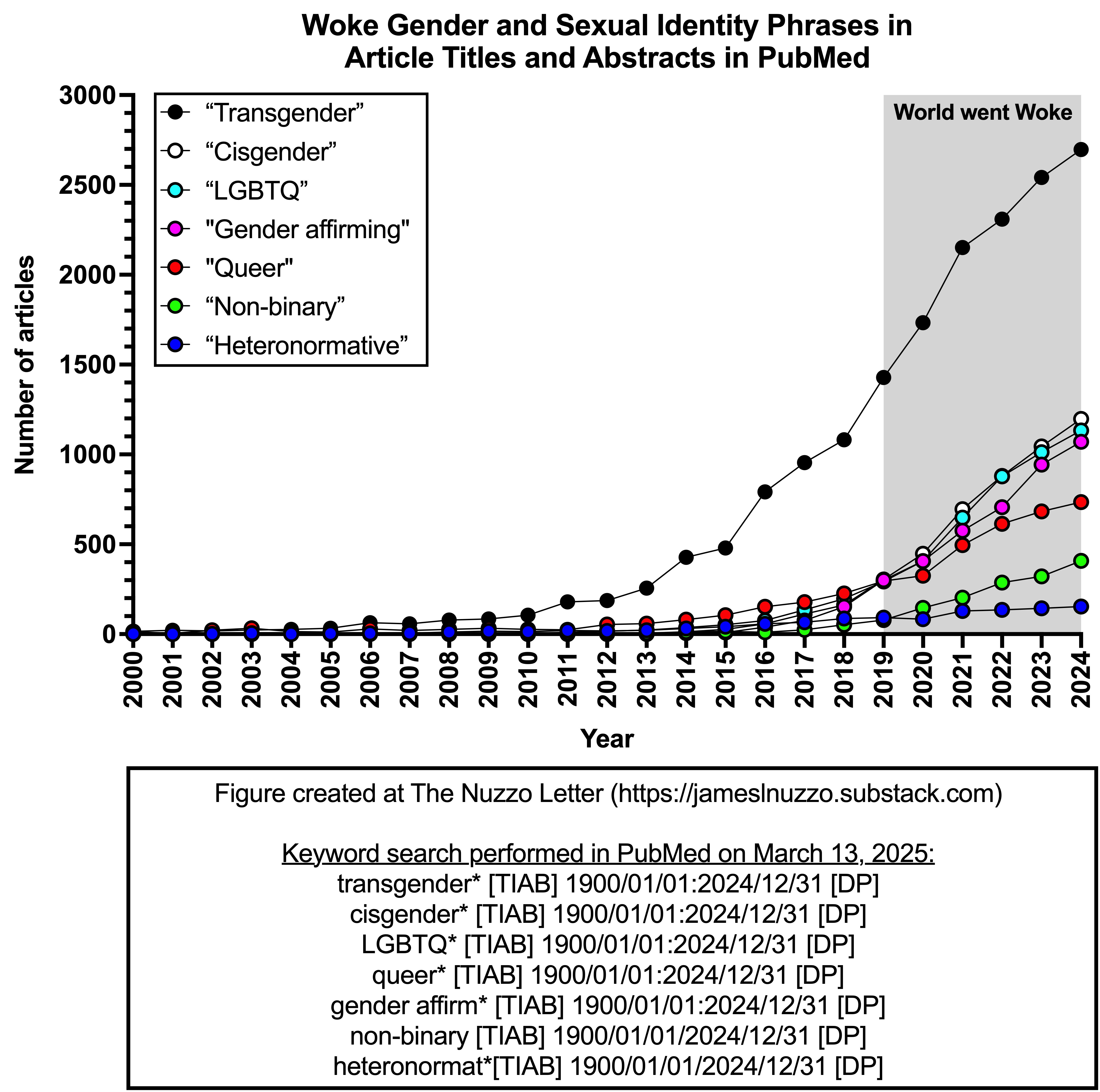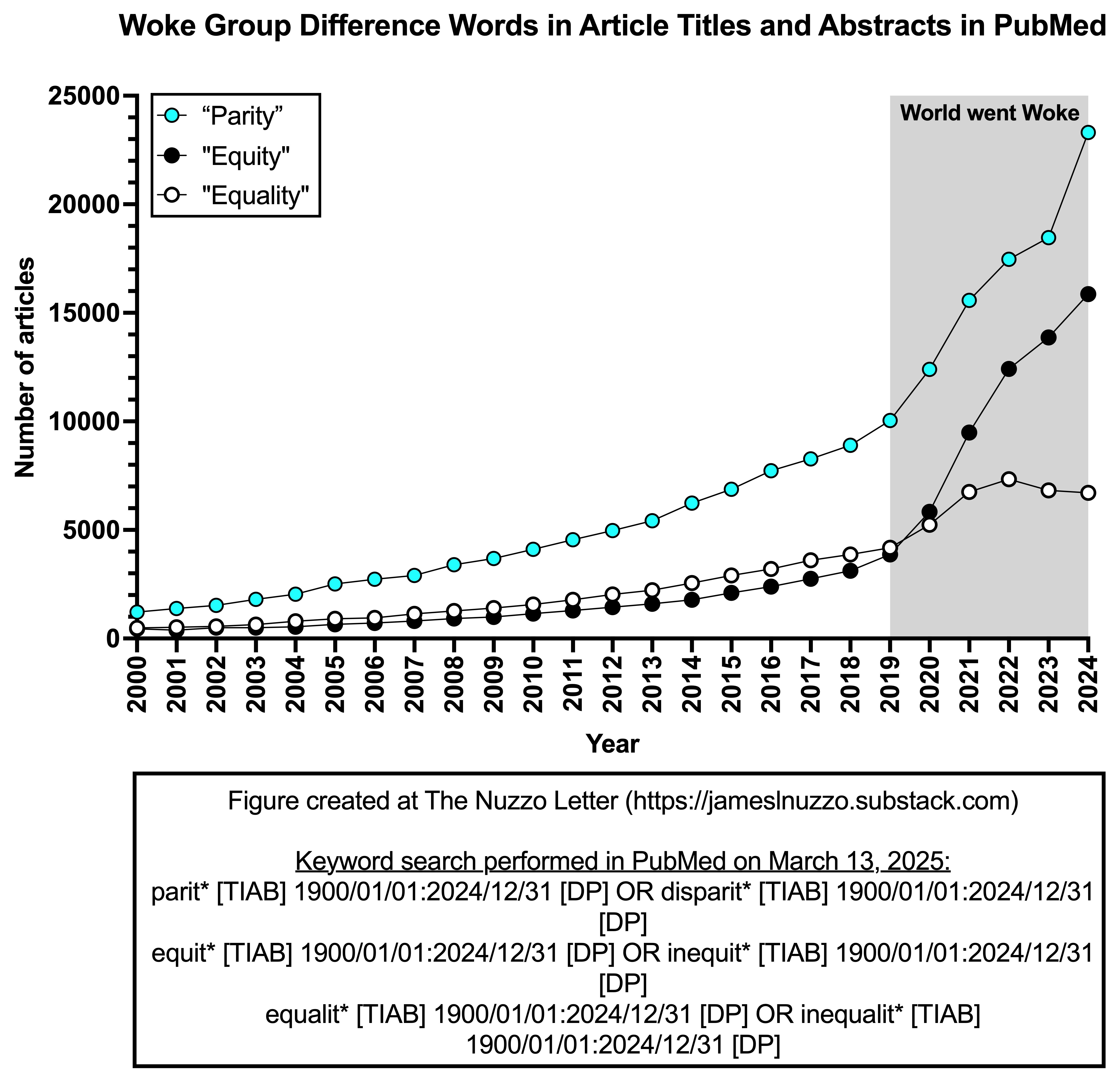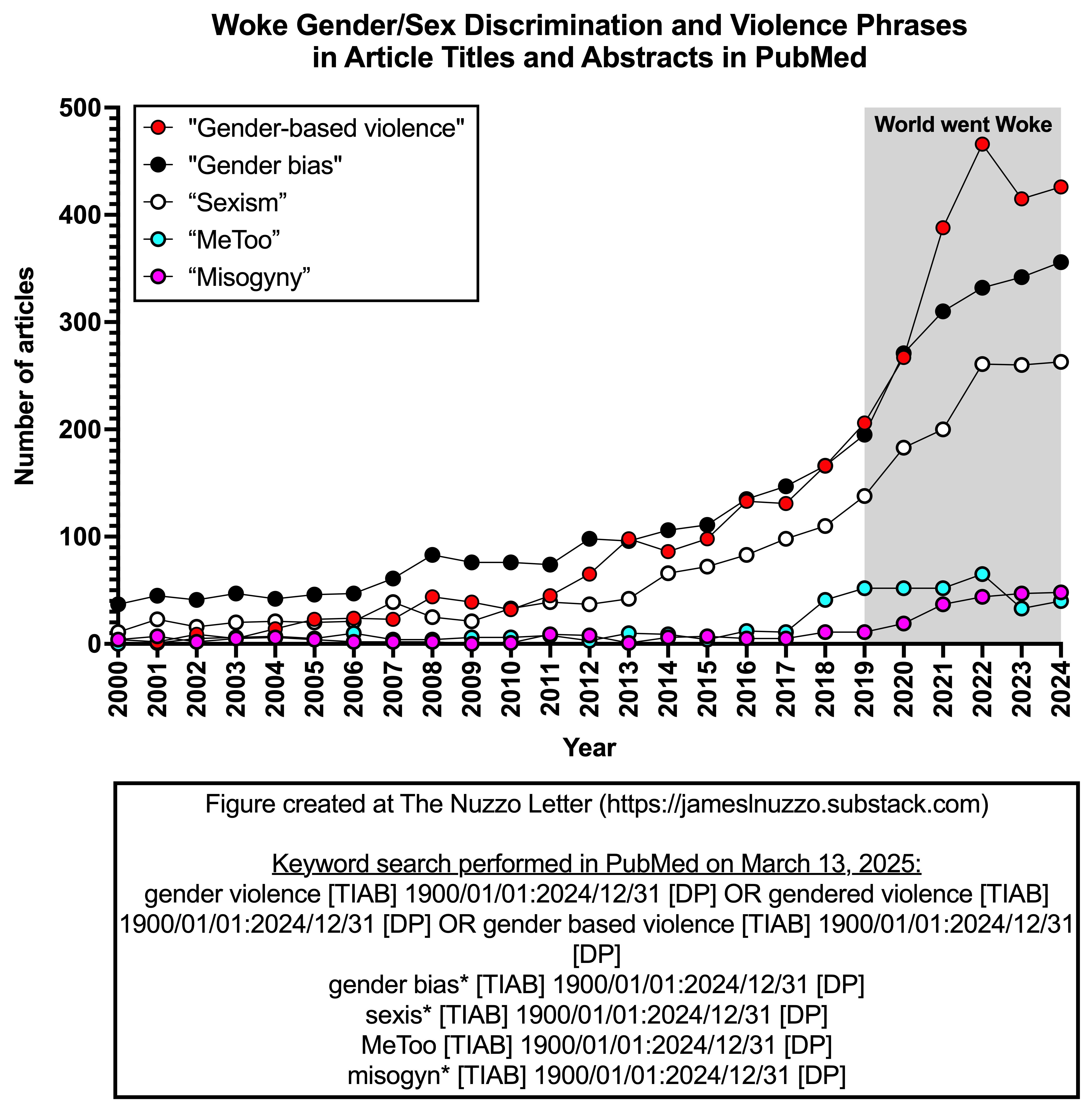 The rise of Woke medicine has also been associated with a heightened focus on sex/gender differences. Relevant words or phrases have included “gender parity,” “gender equity,” “gender equality,” and “gendered.”