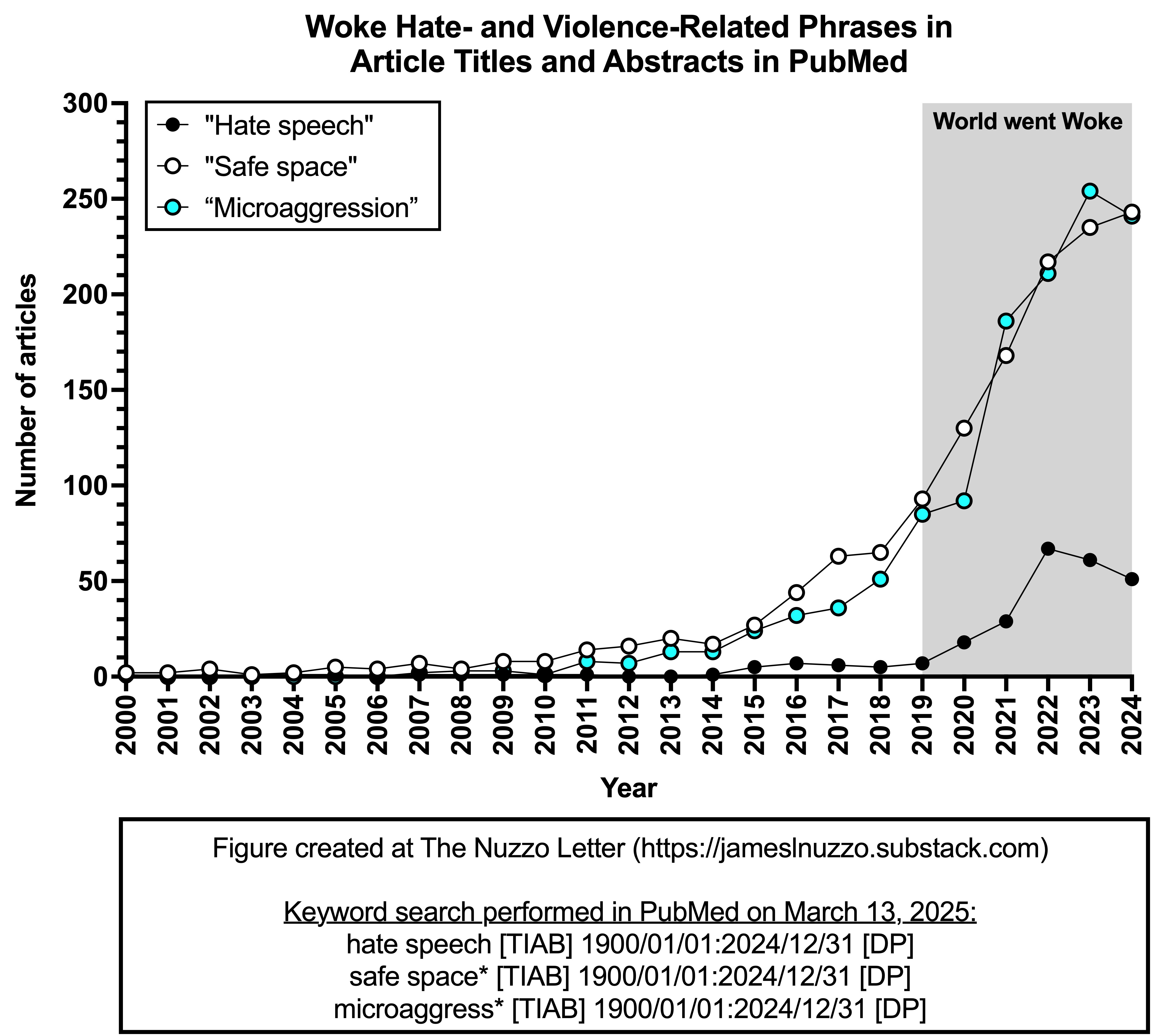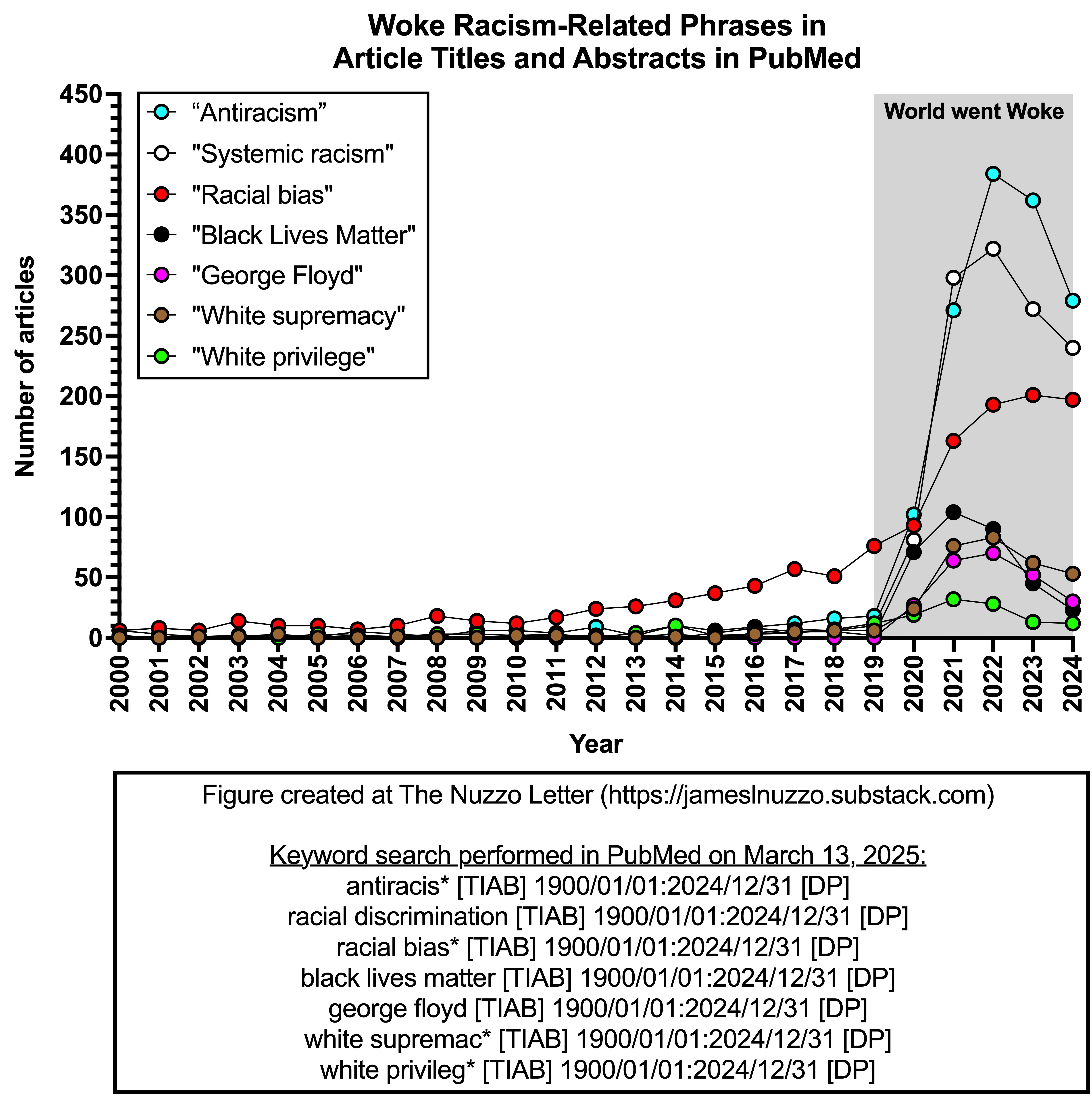 Only PubMed was searched. Several other databases of academic articles exist. PubMed generally indexes journals in the biomedical and life sciences. Thus, journals in other academic areas, including many areas in the humanities, where Woke is most common, were not searched. The current graphs do not represent the totality of Woke in the academy. Instead, the current graphs represent Woke medicine and healthcare.