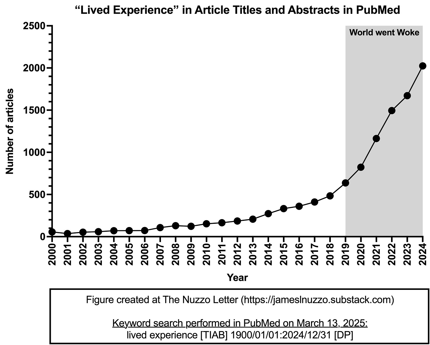 Accelerated use of the phrase “lived experience” in the titles and abstracts of articles indexed in PubMed occurred starting around 2019. Between 2019-2024, the phrase “lived experience” was used in the titles or abstracts of 9,676 articles indexed in PubMed.