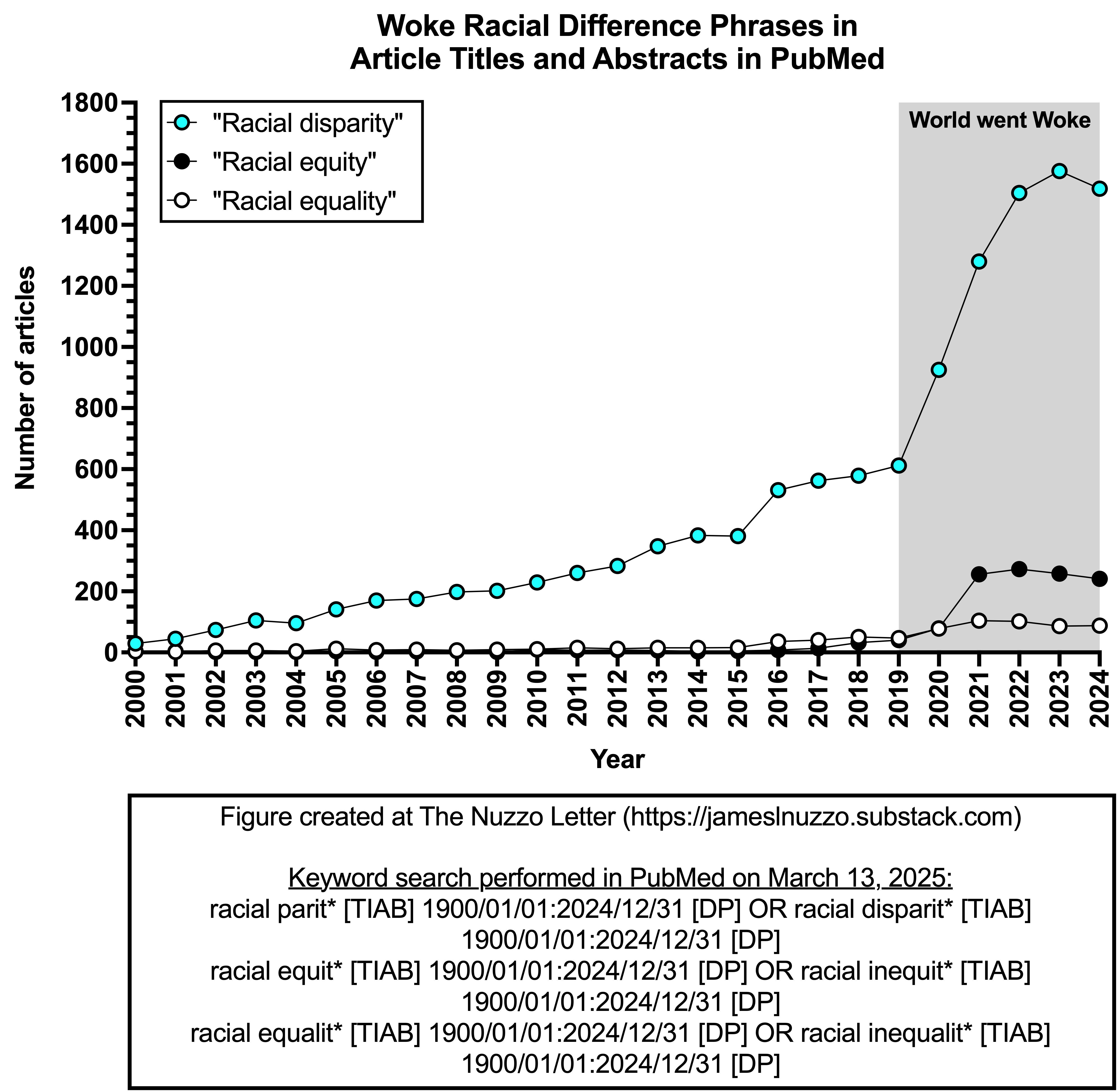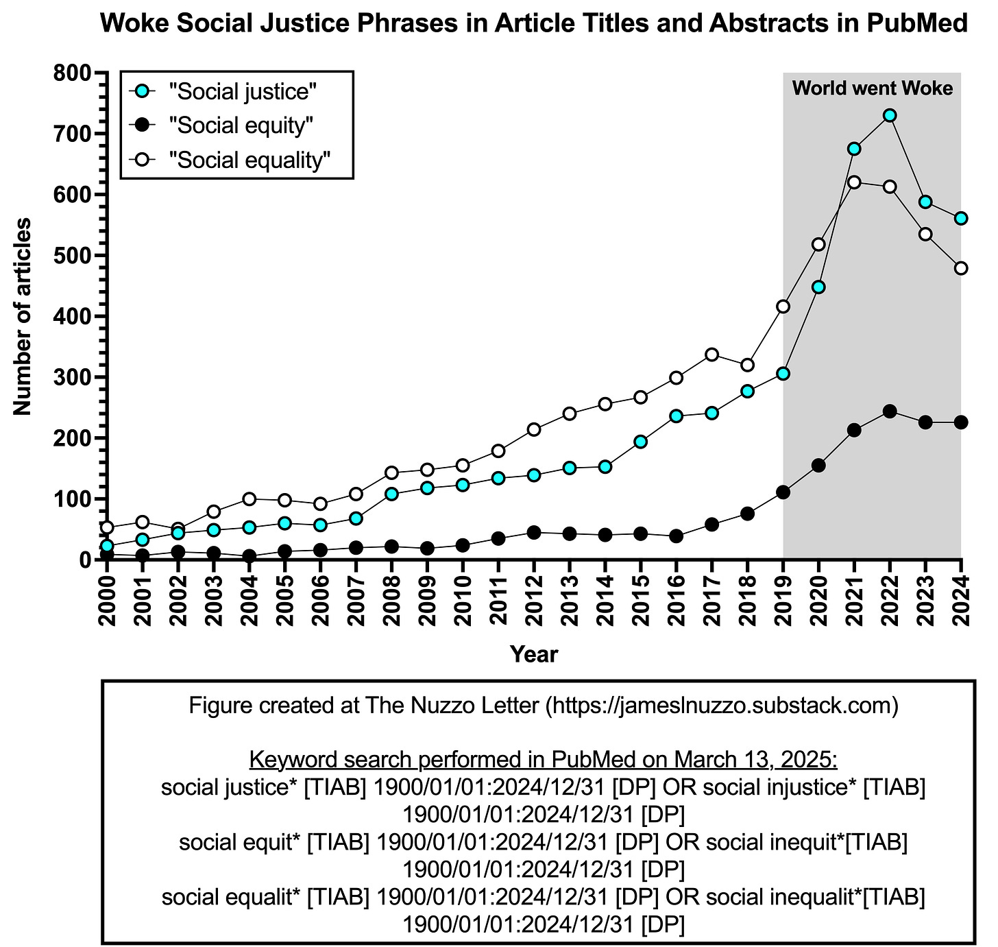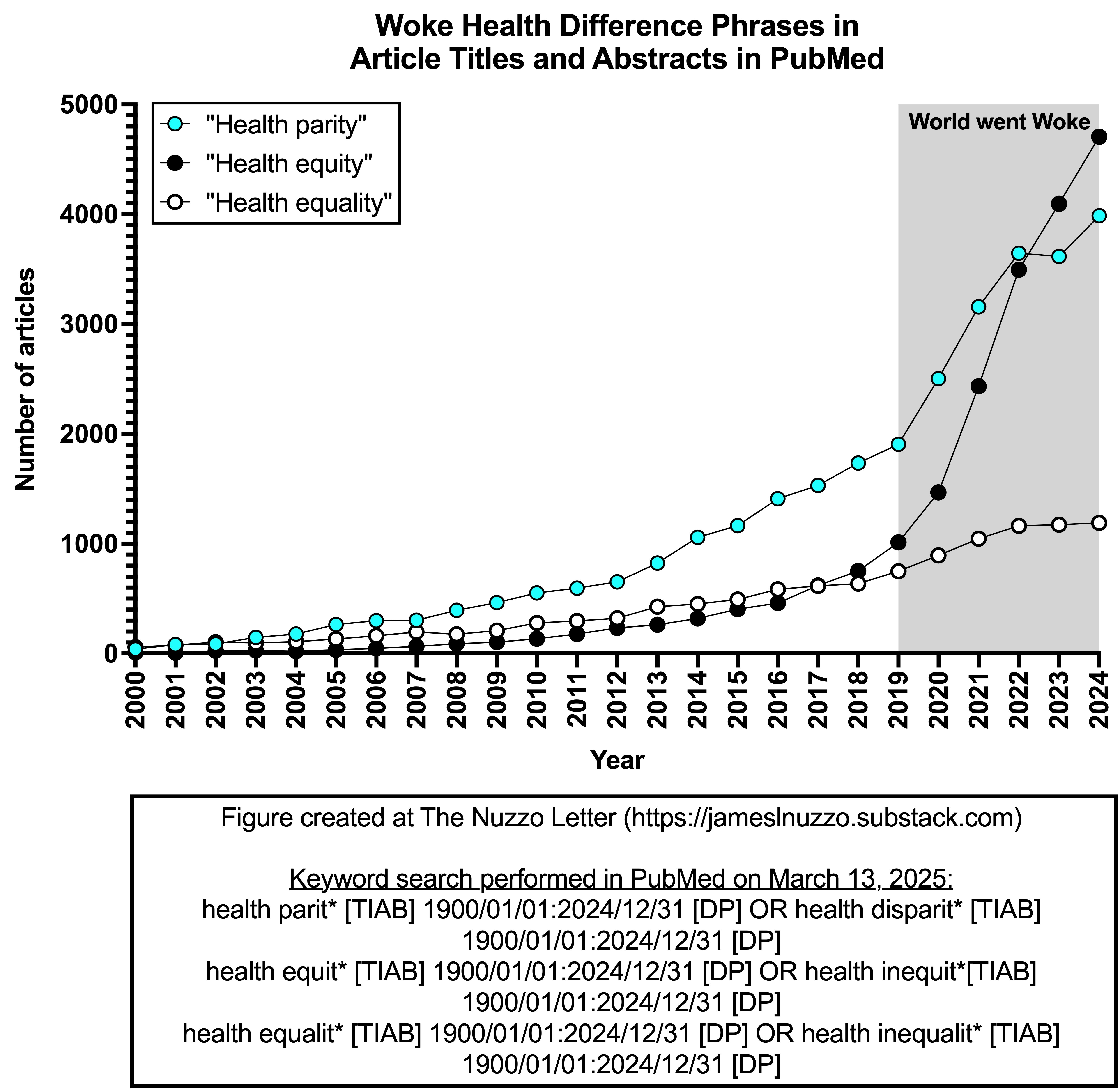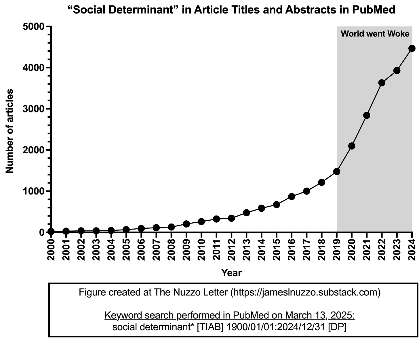 The crusade on the “social determinants of health” occurred prior to the modern Woke movement, which is why regular use of the phrase “social determinant” appears in the graph prior to 2019. However, from 2019 to 2020, one can see accelerated use of this phrase in the titles and abstracts of articles indexed in PubMed. This happened because the “social determinants of health” movement has, for most of its history, been associated with the concept of “health equity” and other aspects of Woke medicine.