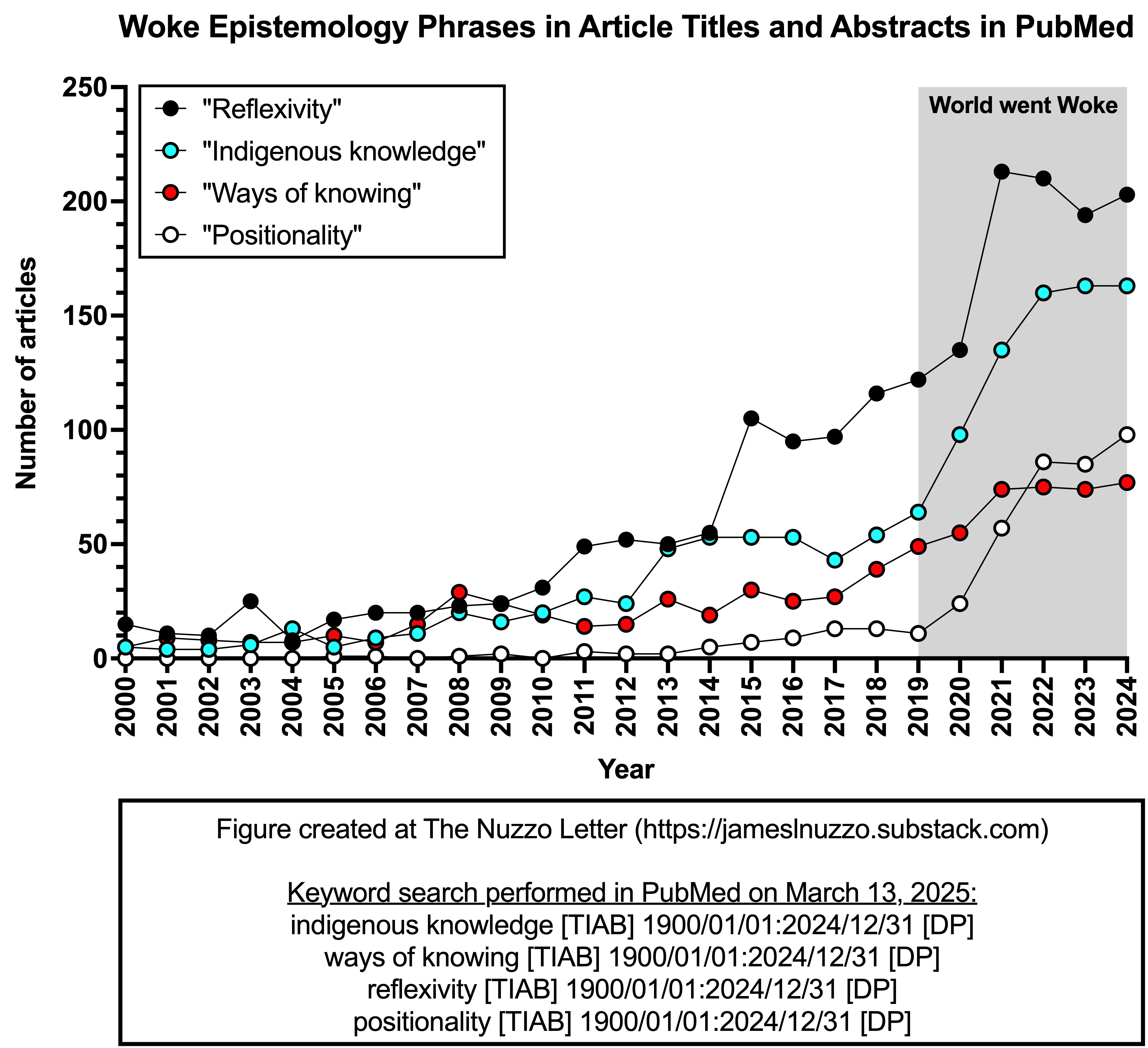 Yet, as can be seen in the graph below, use of the word “positionality,” as well as other Woke epistemology words, has increased since 2019. Few things could be more deadly for objective science than the adoption of these components of subjective epistemology. See my article on rigged Woke “research” for a related discussion.