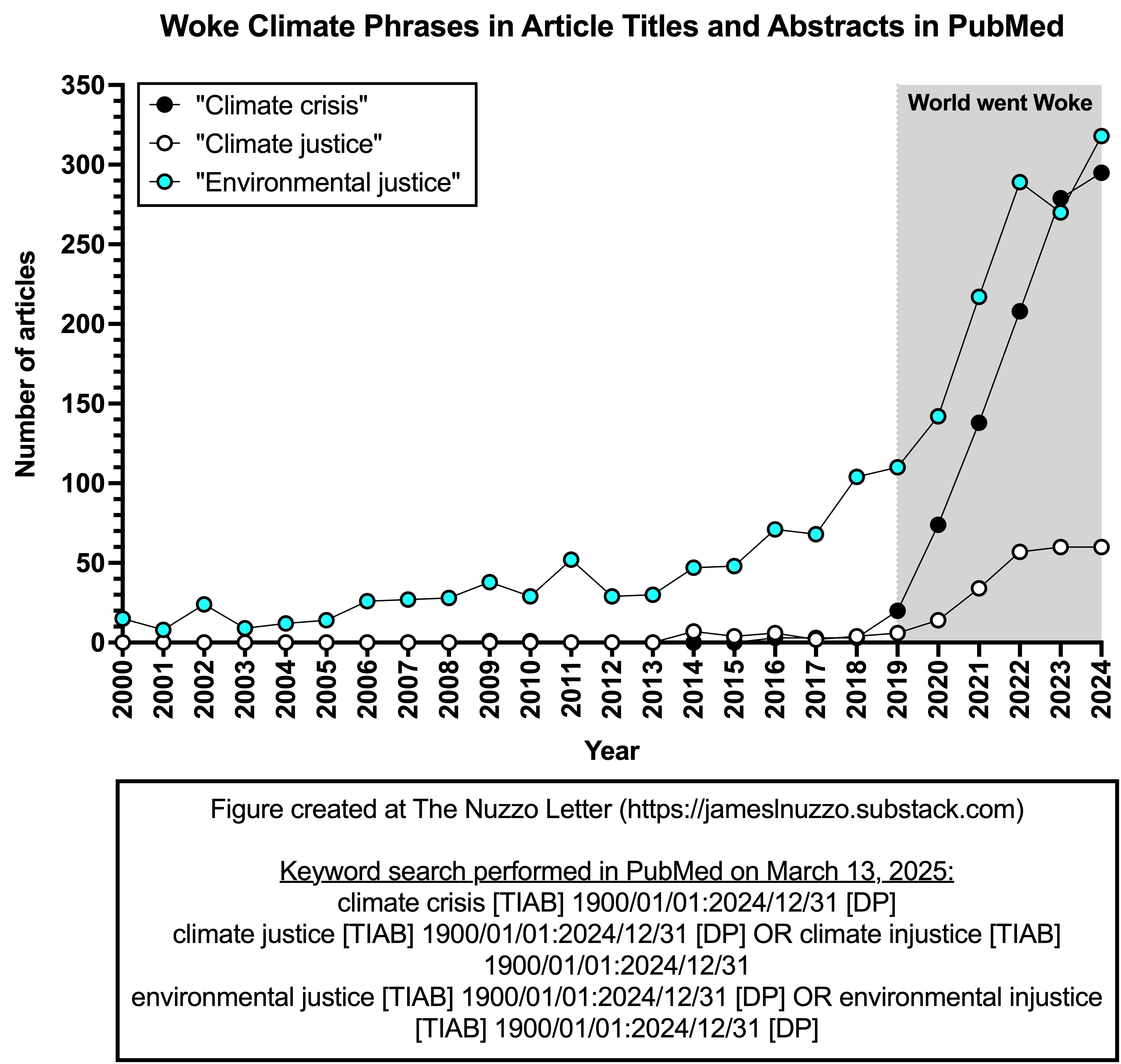 Use of the Woke climate phrases “climate crisis,” “climate justice,” and “environmental justice” has increased noticeably since 2019.
