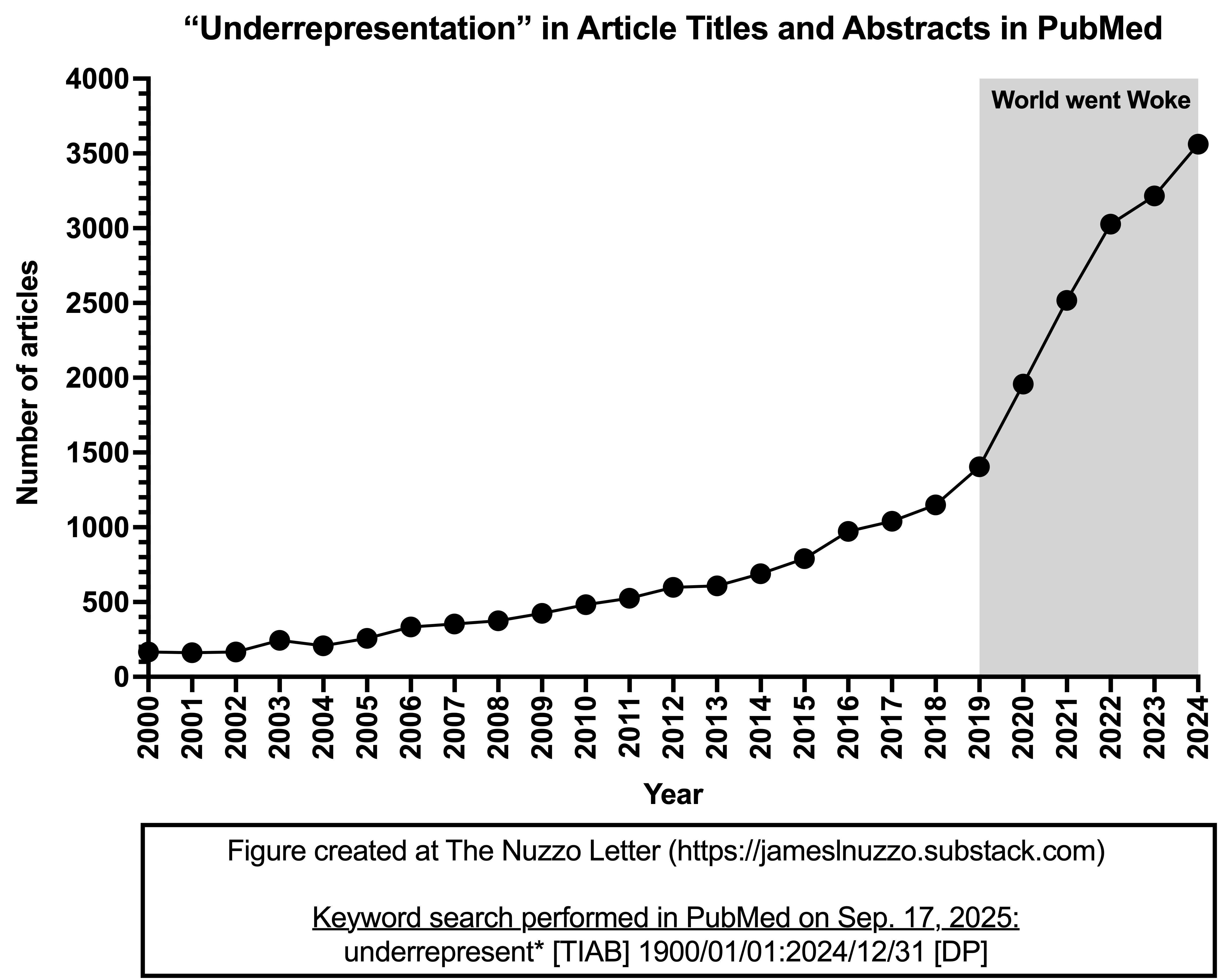 Use of the word “underrepresentation” (or “underrepresented”) accelerated in 2019. Between 2019-2024, the word “underrepresentation” (or “underrepresented”) was used in the titles or abstracts of 15,686 articles indexed in PubMed.