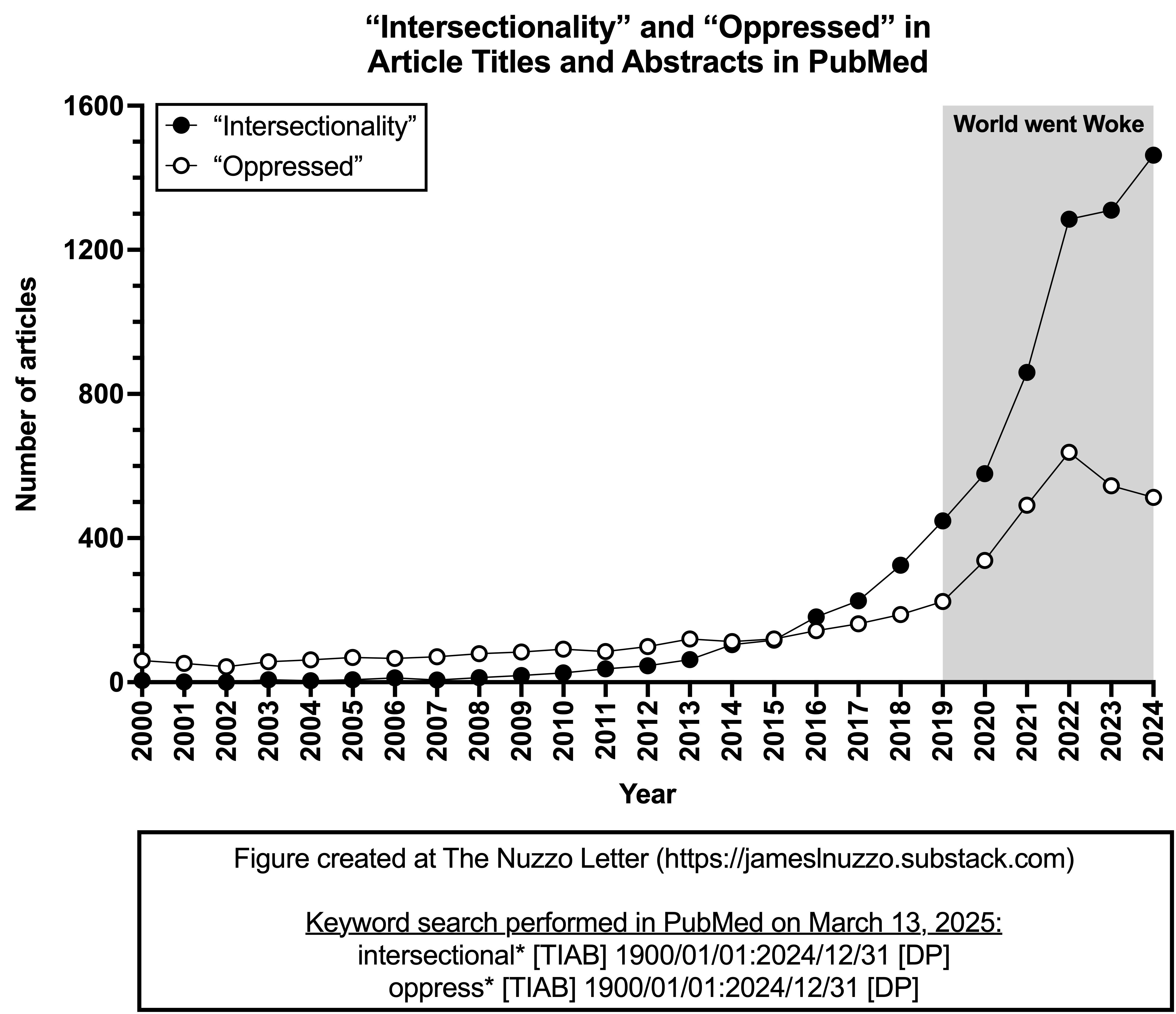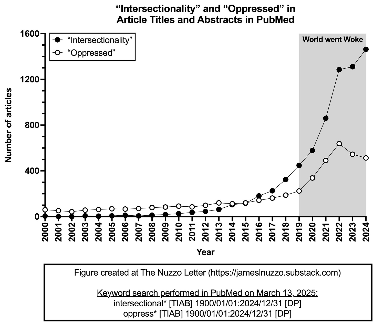 The words “intersectionality” and “oppressed” (or “oppression”) have been used in the titles and abstracts of hundreds of articles indexed in PubMed. Notable increases in use of these two words were observed between 2018 and 2020.